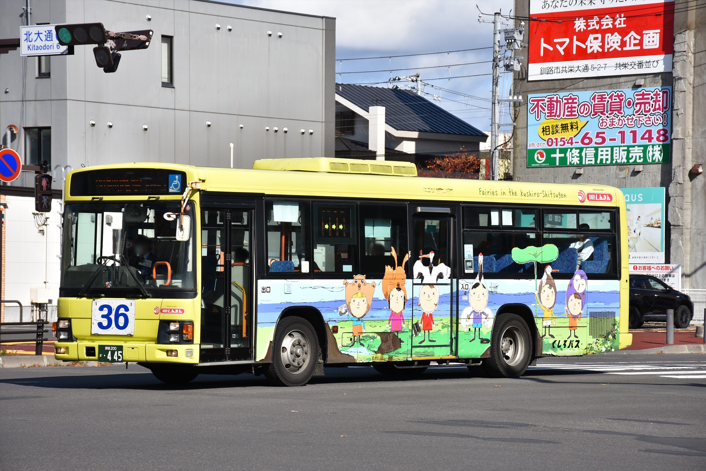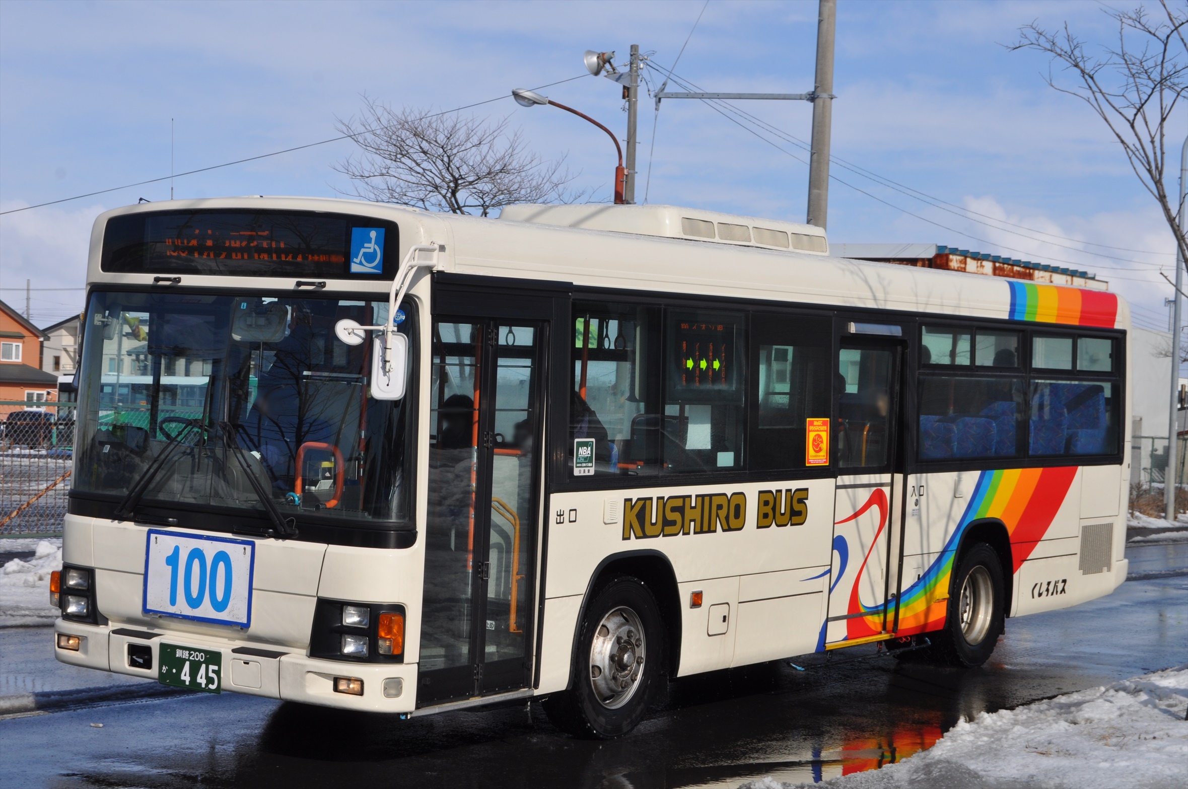 【くしろバス】釧路200か445 2025.12.27 北海道内のバス釧路ナンバー 2002年式いすゞくしろバス元京浜急行バス移籍車 釧路200か445(くしろバス本社営業所 2002年式 いすゞエルガ/KL-LV280L1) 2020年10月 釧路市 撮影:OTB 2014年にくしろバスが導入した移籍車。 もともとは2002年に京浜急行バスが新製導入した車両である。 くしろバスでのデビュー当初は主に100(イオン線)で使用されていたが、ラッピングが施されて以降は主に36(白糠線)使用されていた。 現在はラッピングが解除され、充当路線も変更されている。 以下の画像はデビュー直後に撮影したもの。 2015年2月 釧路市 撮影:OTB