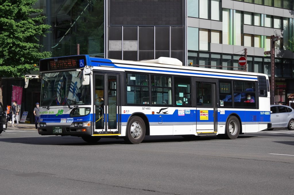 【ジェイ・アール北海道バス】527- 4903 札幌200か1480 2025.09.16 ジェイ・アール北海道バス日野 2005年式引退済み日野自社発注車 527-4903 札幌200か1480(ジェイ・アール北海道バス札幌→手稲営業所 2005年式 日野ブルーリボンシティ/KL-HU2PPEE) 2020年8月 札幌駅 撮影:MAPBUS 2004年度導入車。当年度のノンステップバスはブルーリボンシティが採用され、3台が札幌営業所に配置された。 トランスミッションはAT, 液晶型運賃表を装備する。 札幌営業所の閉所に伴い、2022年4月に手稲営業所に転属した。 2025年2月に除籍となった。