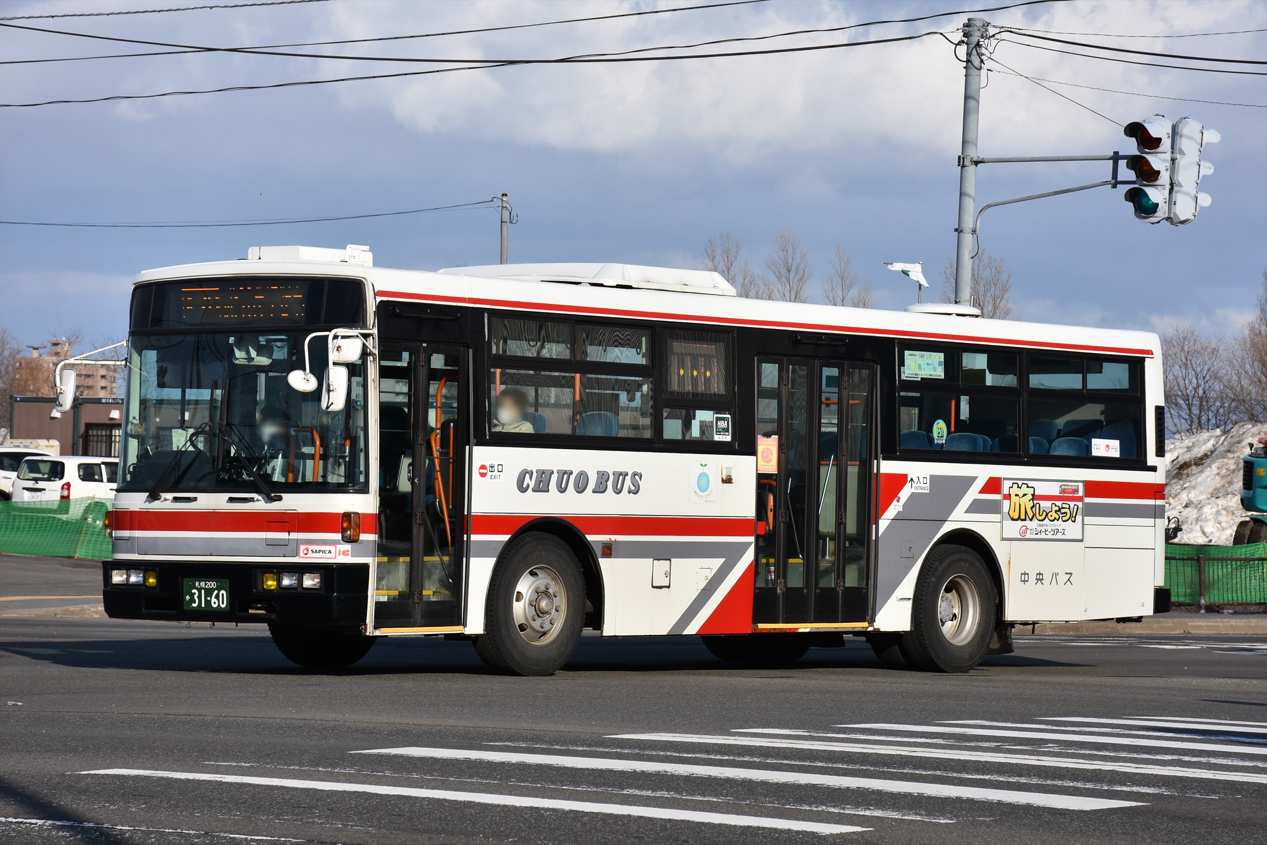 【北海道中央バス】札幌200か3160 2025.11.03 北海道中央バス日産ディーゼル・UDトラックス 1999年式元名古屋市交通局引退済み移籍車 札幌200か3160(北海道中央バス新川営業所 1999年式 日産ディーゼル+富士重工7E/KC-UA460LAN) 2021年3月 札幌市北区 撮影:OTB 2012年春に北海道中央バスが導入した移籍車。 もともとは1999年に名古屋市交通局が新製導入した車両である。 北海道中央バスでは2011年度から2012年度にかけて名古屋市交通局からの移籍車が導入されたが、この車両は2012年導入分の第一号であった。 北海道中央バス移籍当初は石狩営業所に配属されたが、のちに新川営業所へ転属した。 2025年7月に解体されている。
