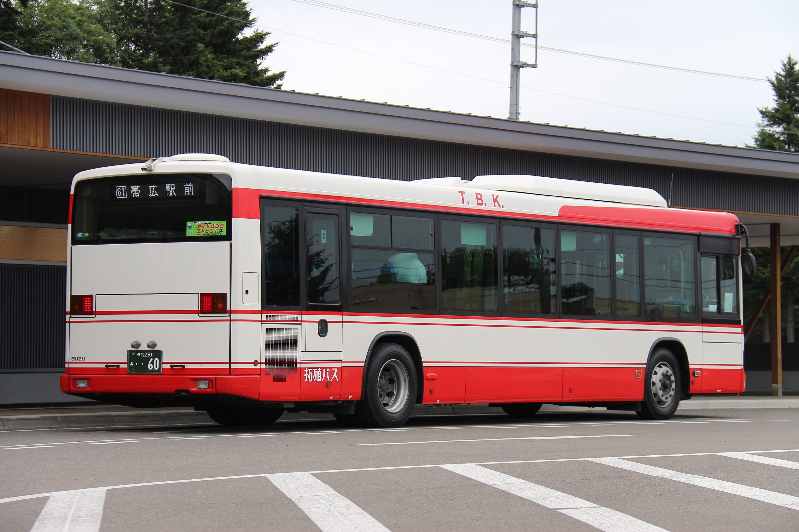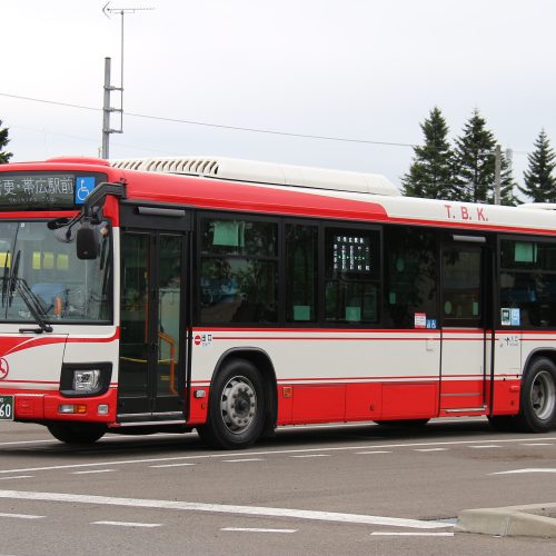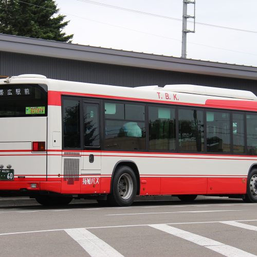 【北海道拓殖バス】帯広230あ60 2025.10.01 北海道内のバス帯広ナンバー 2021年式いすゞ北海道拓殖バス自社発注車 帯広230あ60(北海道拓殖バス上士幌営業所 2021年式 いすゞエルガ/2TG-LV290Q3) 2022年7月 上士幌町内 撮影:kido82009 2022年7月 上士幌町内 撮影:kido82009 2021年1月、北海道拓殖バスが新製導入した車両で、上士幌営業所に所属している。 2021年1月11日に北海道拓殖バスが創業60周年を迎え、その記念として赤白復刻カラー車として導入された。 当初は帯広200か359で登録されたが、運用開始時には創業60周年にちなんで帯広230あ60に再登録された。 2021年2月から運用開始、主に上士幌交通ターミナル~帯広駅前間の運用に就いている。