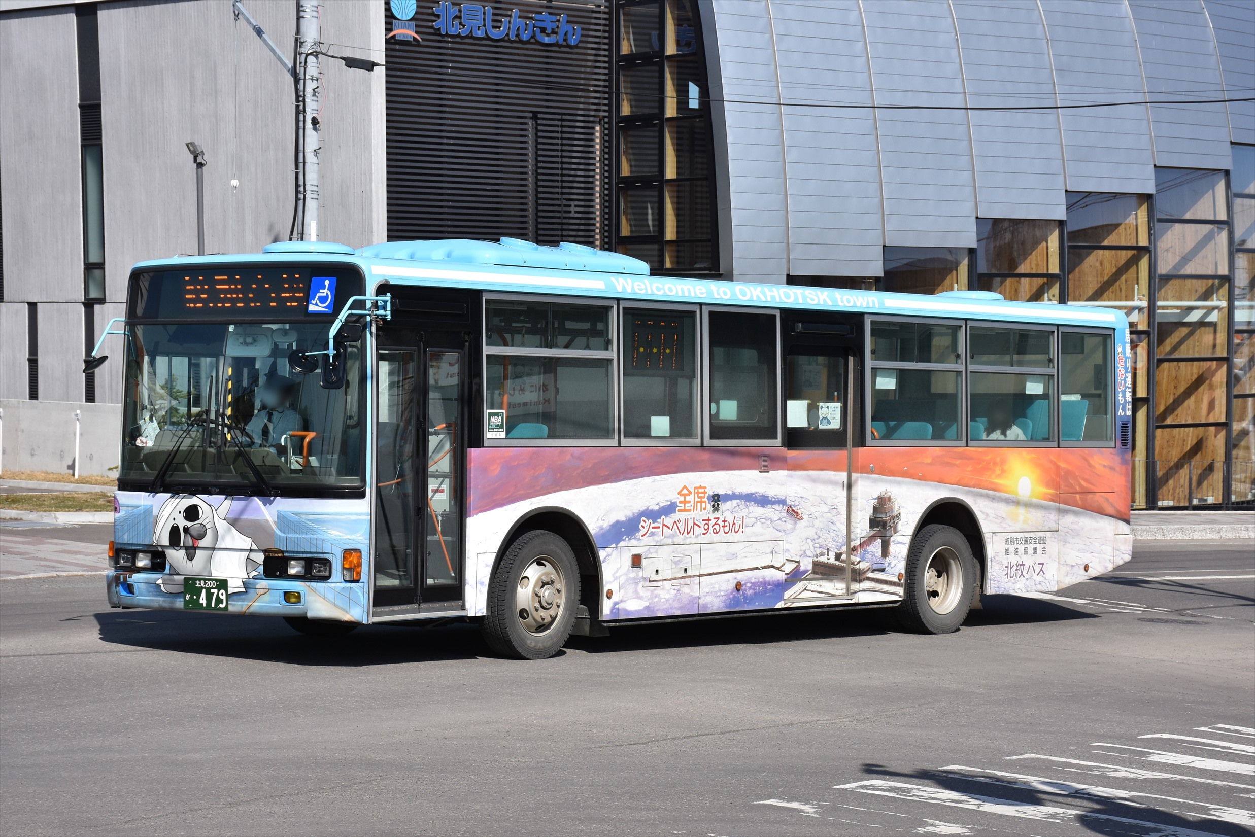 【北紋バス】北見200か479 2025.12.08 北海道内のバス北見ナンバー 2005年式三菱ふそう元神奈川中央交通北紋バス移籍車 北見200か479(北紋バス本社営業所 2005年式 三菱ふそうエアロスター/PJ-MP35JM) 2021年4月 紋別市 撮影:OTB 2020年に北紋バスが導入した移籍車。 もともとは2005年に神奈川中央交通が新製導入した車両。 本型式は神奈川中央交通から4台移籍した。 それぞれ異なるデザインのラッピングを纏っており、沿線観光地やキャラクターが描かれている。