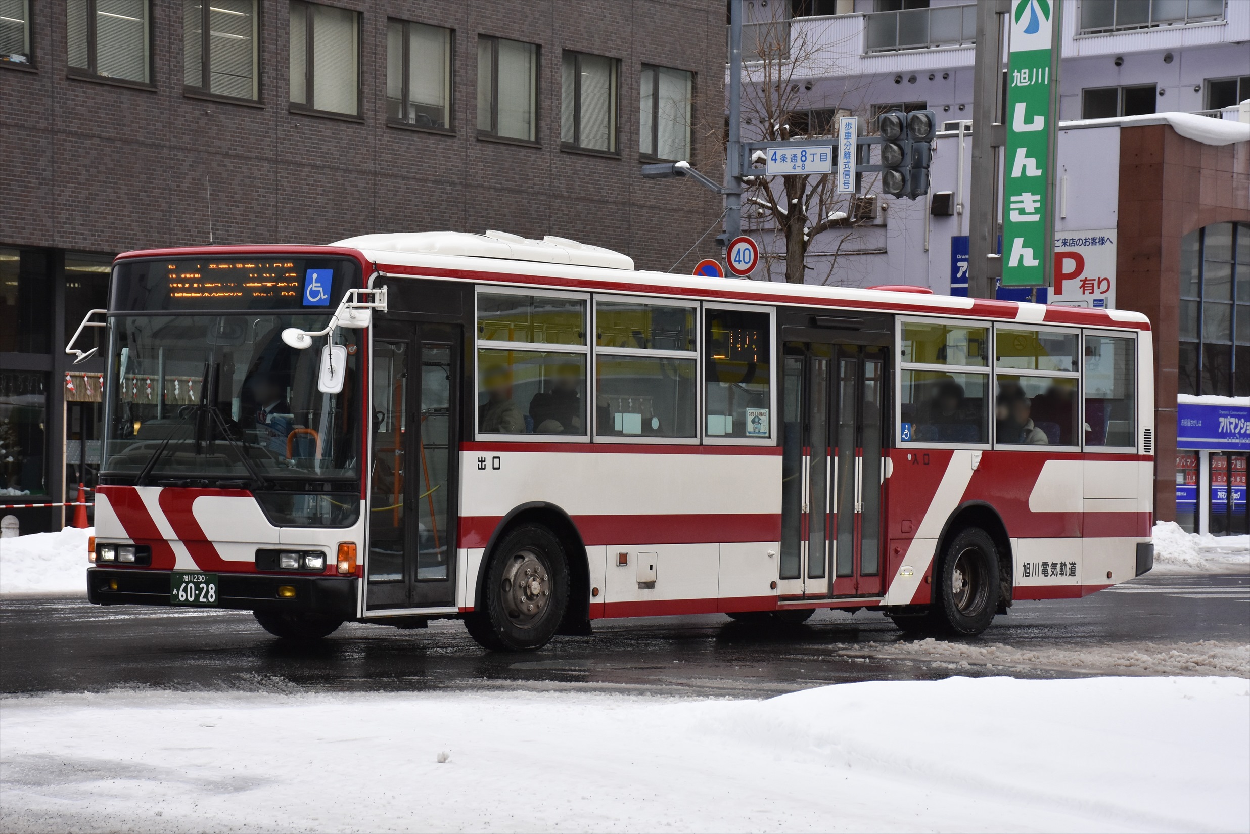 【旭川電気軌道】旭川230あ6028 2025.12.29 北海道内のバス旭川ナンバー 2006年式三菱ふそう元立川バス旭川電気軌道移籍車 旭川230あ6028(旭川電気軌道共栄営業所 2006年式 三菱ふそうエアロスター/PJ-MP35JM改) 2025年12月 旭川市 撮影:OTB 2025年12月に旭川電気軌道が導入した車両。 もともとは2006年に立川バスが新製導入した車両で、混雑路線(応現院線)向けの長尺・中扉4枚折戸仕様である。 側面の行先表示器は廃車発生品と思われる小型のものに交換されている。 共栄営業所に所属し、管内の各路線で使用されている。
