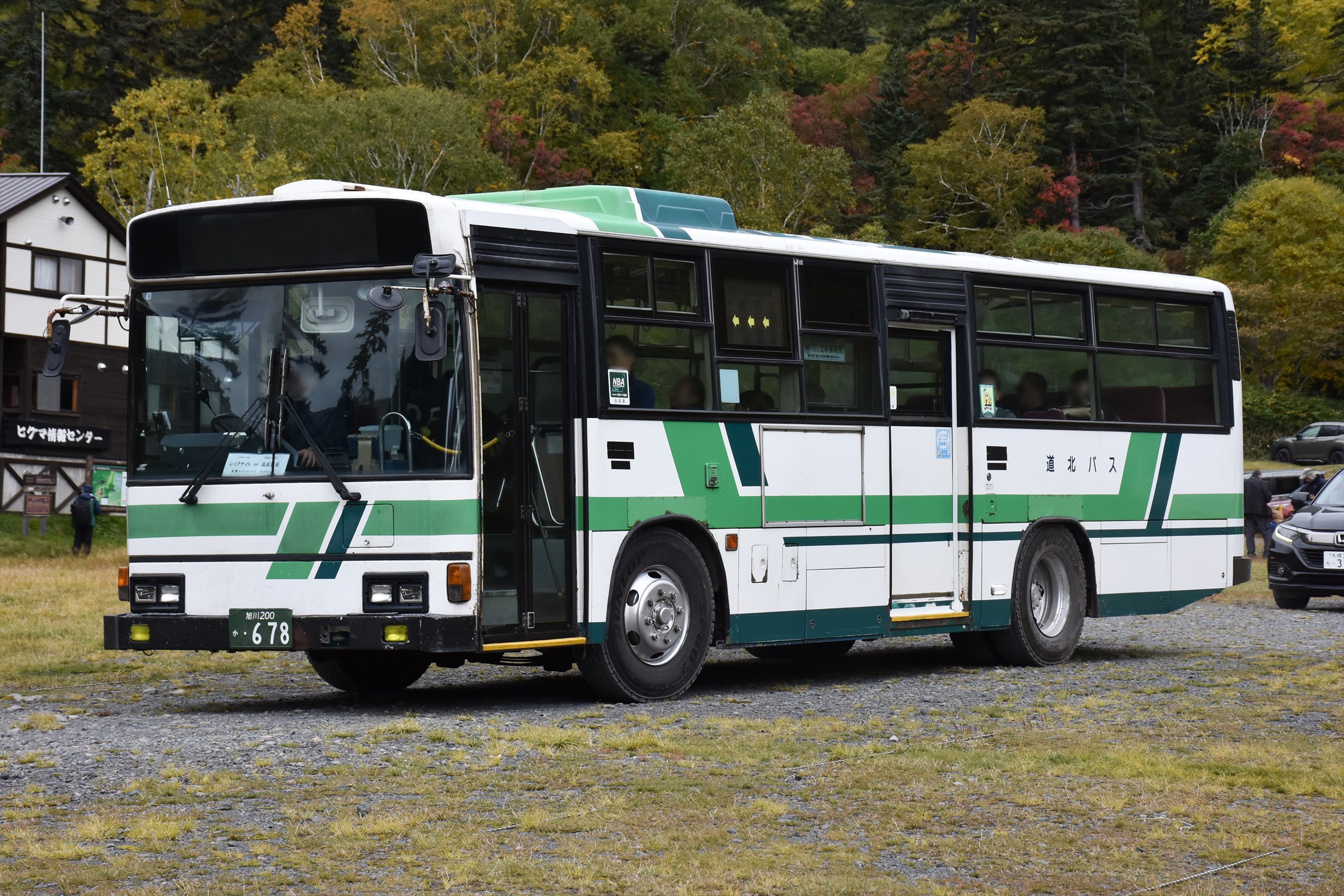 【道北バス】旭川200か678 2026.02.06 北海道内のバス旭川ナンバー 1996年式元川崎鶴見臨港バス日野移籍車道北バス 旭川200か678(道北バス本社営業所 1996年式 日野ブルーリボン/KC-HT2MLCA) 2024年9月 上川町 撮影:OTB 2009年に道北バスが導入した移籍車。 もともとは1996年に川崎鶴見臨港バスが新製導入した車両である。 道北バスには3台が移籍した。 スクール用として再登録された車両も存在していたが、この車両は最後まで登録変更されずに活躍した。 晩年は期間限定運行の100(高原温泉シャトルバス)・199(銀泉台シャトルバス)でも使用され、山奥の未舗装路を走行していた。 2024年9月 大雪高原温泉 撮影:OTB