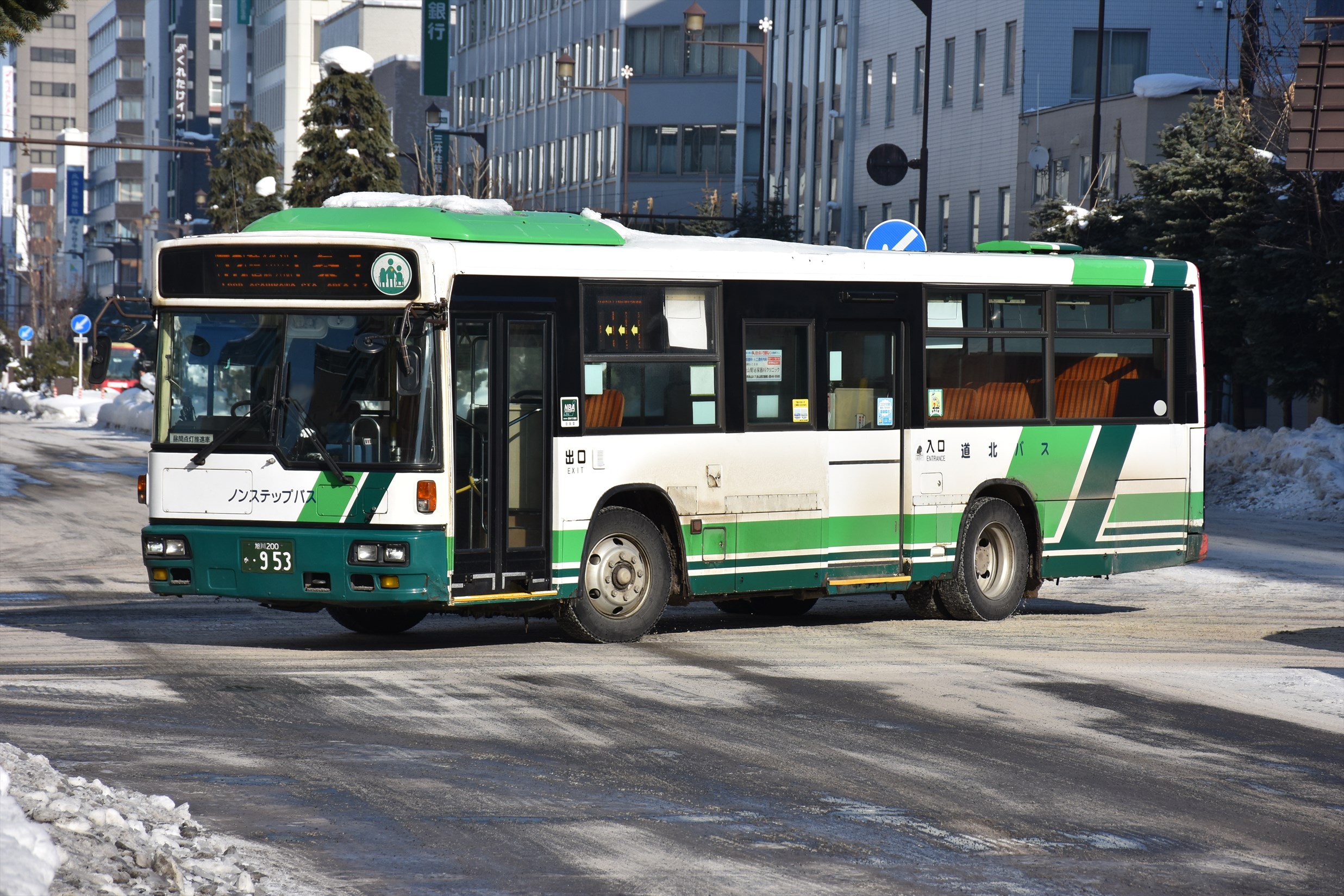【道北バス】旭川200か953 2025.12.222025.12.24 北海道内のバス旭川ナンバー 2000年式元尼崎市交通局日産ディーゼル移籍車道北バス 旭川200か953(道北バス本社営業所 2000年式 日産ディーゼル+西工96MC/KC-UA460HAN) 2025年1月 旭川市 撮影:OTB 2000年に尼崎市交通局が導入した車両で、2013年秋に道北バスへ移籍した。 KC-UA460HANのノンステップ車は全国的に採用例が少ないが、道北バスでは尼崎市交通局および横浜交通開発からの移籍車がまとまった台数在籍している。 2024年頃、バンパーが廃車発生品(KL-UAで使用されていたもの)に交換されている。