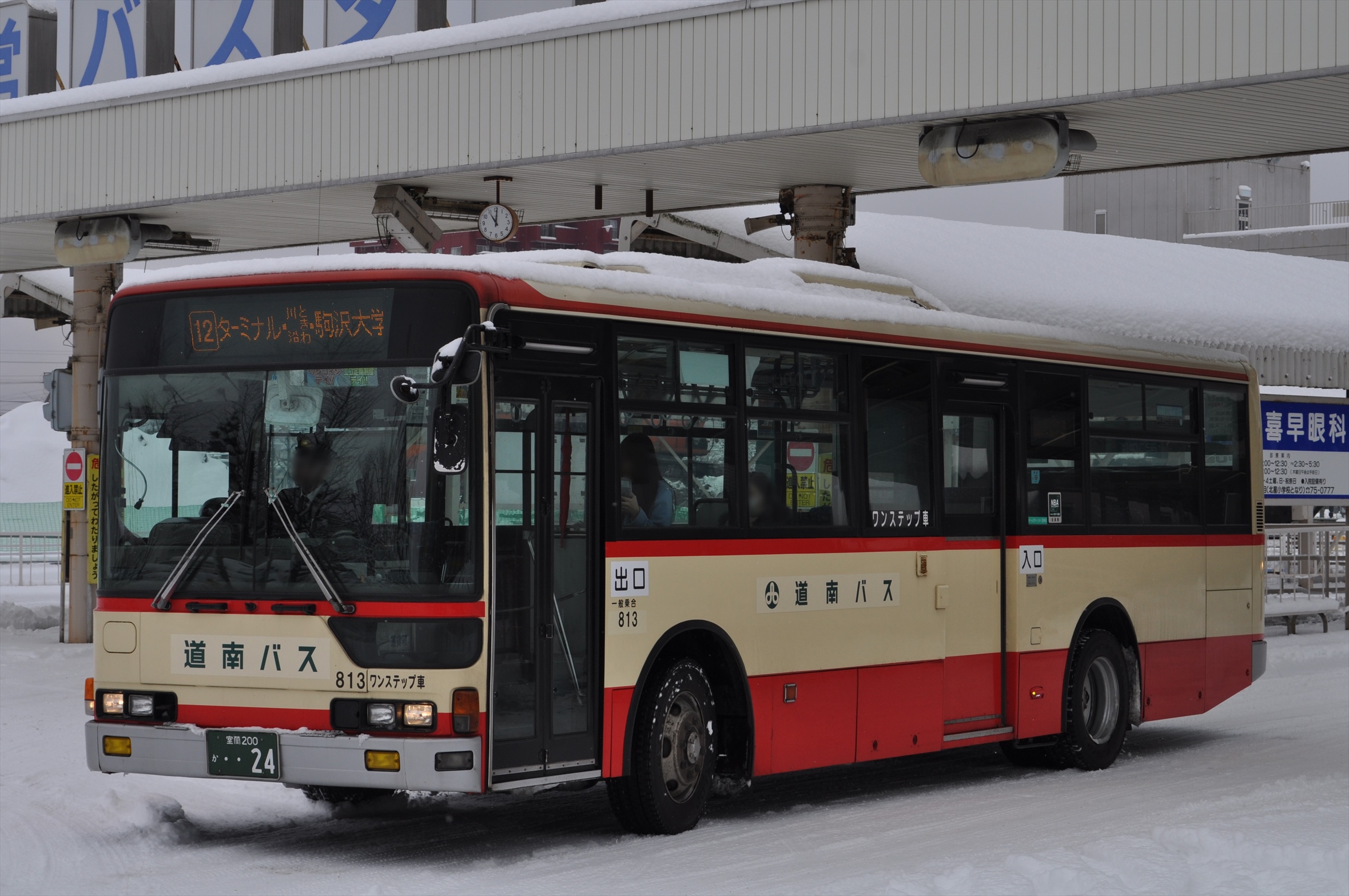 【道南バス】813 室蘭200か24 2025.11.16 北海道内のバス室蘭ナンバー 1999年式三菱ふそう引退済み苫小牧市交通部道南バス 813 室蘭200か24(道南バス錦西営業所 1999年式 三菱ふそうエアロスター/KC-MP717M) 2012年12月 苫小牧市 撮影:OTB 1999年に苫小牧市交通部が新製導入した車両で、車番は22号車であった。 2012年のバス事業廃止時、道南バスへ譲渡され、車番が813号車に改められた。 苫小牧市交通部では1997年から1999年にかけてワンステップ車が採用されたが、三菱ふそう製のワンステップ車は1999年に2台導入されたのみであった。 道南バスでの活躍は短く、2018年3月に解体されている。