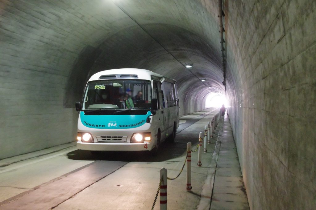 トンネルには歩道もあり、電気バスを利用せずにダムへ向かうこともできる(距離約2㎞, 徒歩約20分以上)
